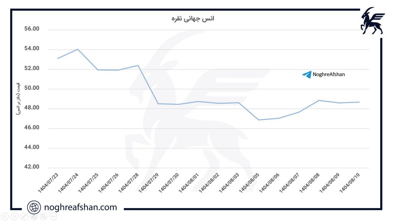 5 الی 9 آبان 1404 (27 الی 31 اکتبر 2025)انس جهانی نقره هفته را با قیمت 48.45 دلار آغاز کرد و در محدودهی 45.57 تا 49.35 دلار نوسان داشت. در پایان معاملات جمعه، قیمت پایانی در سطح 48.66 دلار ثبت شد که نسبت به هفتهی قبل رشد خفیف 0.17 درصدی را نشان میدهد. نقره طی هفتهی گذشته بارها برای عبور از مقاومت 49.2 دلار تلاش کرد، اما با فشار فروش در سطوح بالاتر مواجه شد و نتوانست سقف جدیدی را تثبیت کند.