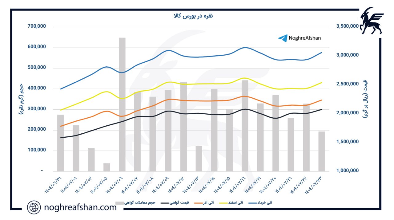 میانگین حجم معاملات (Volume) در این هفته 295 کیلوگرم بود که نسبت به هفتهی قبل 12.9 کاهش را نشان میدهد. کاهش نسبی حجم همراه با ثبات قیمت، نشانگر فاز تجمیع و استراحت (Consolidation) در بازار پس از رشدهای سریع ابتدای مهر ماه است. الگوی حجمی نمودار نیز بیانگر کاهش موقتی هیجان خرید و بازگشت آرامش به معاملات است.