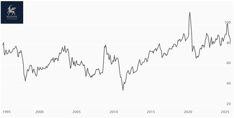 از دههی ۱۹۷۰ (زمان کنار گذاشتن استاندارد طلا)، میانگین بلندمدت این نسبت حدود ۶۵ به ۱ بوده است.